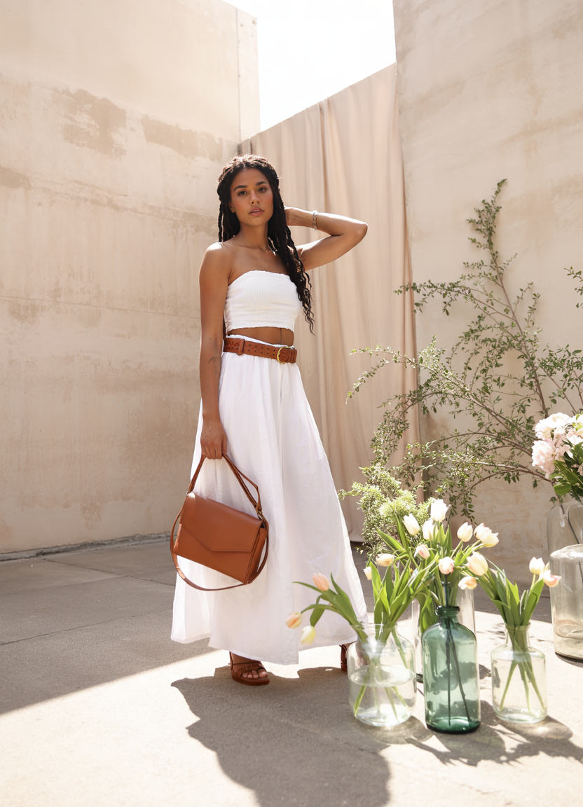 For summer enjoyment, here is a brand new fresh white outfit featuring a strapless smocked crop top and flowing wide skirt. A brown textured belt serves two purposes, providing structure while adding an earthy detail that enhances the look. A tan handbag completes the look as this outfit provides easy elegance and comfortable XL style while maintaining its hot, effortless character. The outfit offers both relaxed style and warm, sunny day wear.