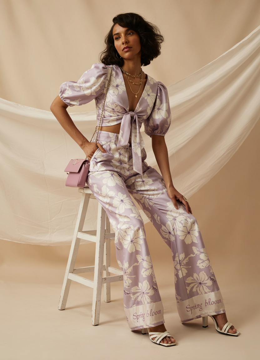 This two-piece lavender satin outfit creates an elegant yet powerful street style look. This outfit consists of a puffy-sleeved, front-tied crop top paired with floral print pants in the latest summer fashion. This outfit provides a smooth finish that is perfect for everyday activities as well as fashion-forward casual daytime social events. This garment combines bold style with the convenience of comfort.