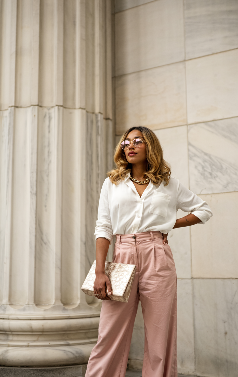 A business casual ensemble combines a light-colored blouse with blush pink wide-legged trousers for an elegant look. The relaxed yet sophisticated silhouette of the loose-fitting fabric is perfect for business needs during office work and work conferences as well as business lunches. People choose this outfit when they need an elegant but informal substitute for a proper suit. A fashionable woman commuting through summer city streets can use this ensemble to great effect.