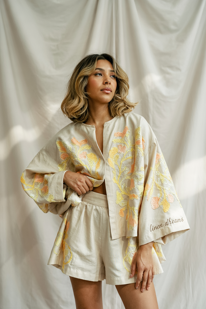#20 Embroidered Linen Set with Loose Jacket and Shorts