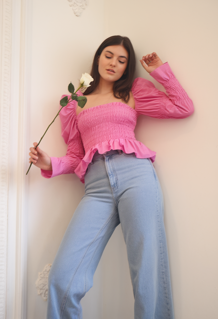 A vibrant pink smocked blouse with voluminous long sleeves and ruffled hem brings a romantic aesthetic to Spring 2025 fashion. The structured yet playful silhouette is balanced by a pair of high-waisted light-wash jeans, creating a casual yet chic outfit for a day in Paris or a stylish school look. The size of the blouse’s gathered details accentuates the waist, making this an ideal ensemble to wear in Florida or for a relaxed weekend in Spain.