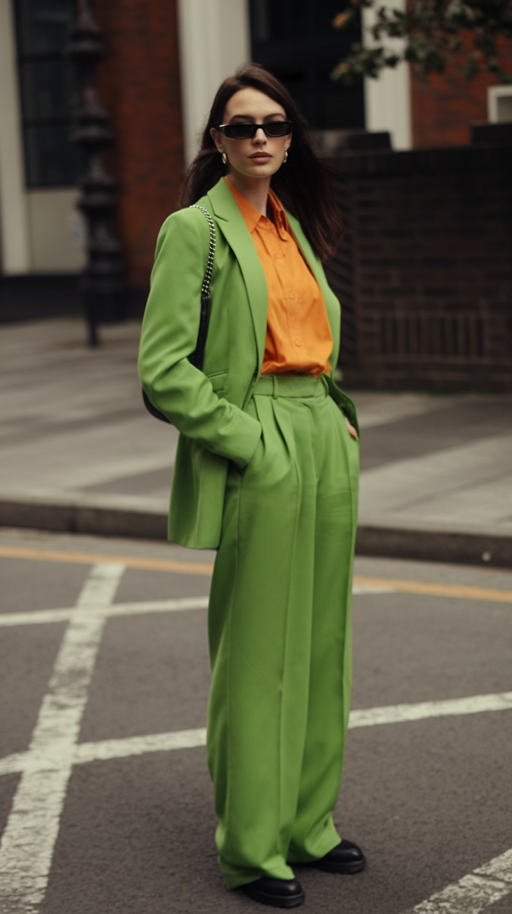 A tailored oversized blazer in a striking green hue is paired with high-waisted wide-leg trousers, creating a bold and contemporary work or office look in New York or Italy in early Spring 2025. The structured fit is softened by a vibrant orange button-up shirt, adding warmth and contrast to the ensemble. Finished with sleek black loafers and a chained shoulder bag, this look is both powerful and effortlessly fashionable, perfect for making an impact at a business event or a stylish outing in Las Vegas.