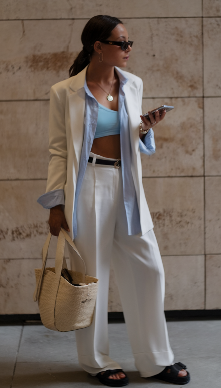 A white oversized blazer layered over a light blue open-button shirt and a matching cropped top creates a modern and refreshing look for Spring 2025. The high-waisted wide-leg trousers add a relaxed elegance, making this an easygoing yet sophisticated outfit to wear in Florida or for a business-casual event in York. Black slides and a woven tote bag complete the ensemble, making it a perfect blend of minimalism and functionality for travel, office days, or a relaxed spring brunch in Spain.