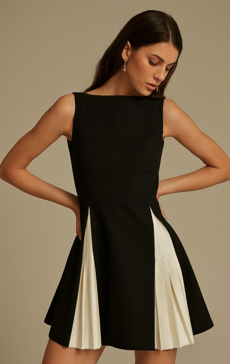 A sleeveless black mini dress with white pleated inserts offers a modern take on monochrome dressing. The flared skirt adds movement and sophistication, making this dress an excellent choice for a stylish dinner in Paris in or an upscale Spring 2025 event. The minimalist design paired with subtle details makes it a refined yet standout piece, ideal for a night out in Italy or a formal office function.