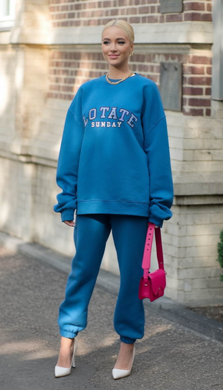 A coordinated oversized sweatshirt and jogger set in a deep teal shade delivers both comfort and style, making it a go-to look for a cold spring day in Spain or York. The casual silhouette is balanced with white pointed-toe heels, adding a polished touch. A hot pink mini handbag provides a bold contrast, bringing a fun and trendy element to this effortlessly chic lounge-inspired look.