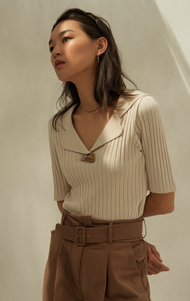 A ribbed beige short-sleeve top with a wide collar and a delicate button detail creates an elegant yet relaxed aesthetic for Spring 2025. Paired with high-waisted brown trousers featuring a structured belt, this outfit is ideal for a polished office look in Paris in or a work setting in New York. The tailored fit and soft neutral tones make it a versatile choice for both cold spring days and warmer afternoons in Italy in early spring.