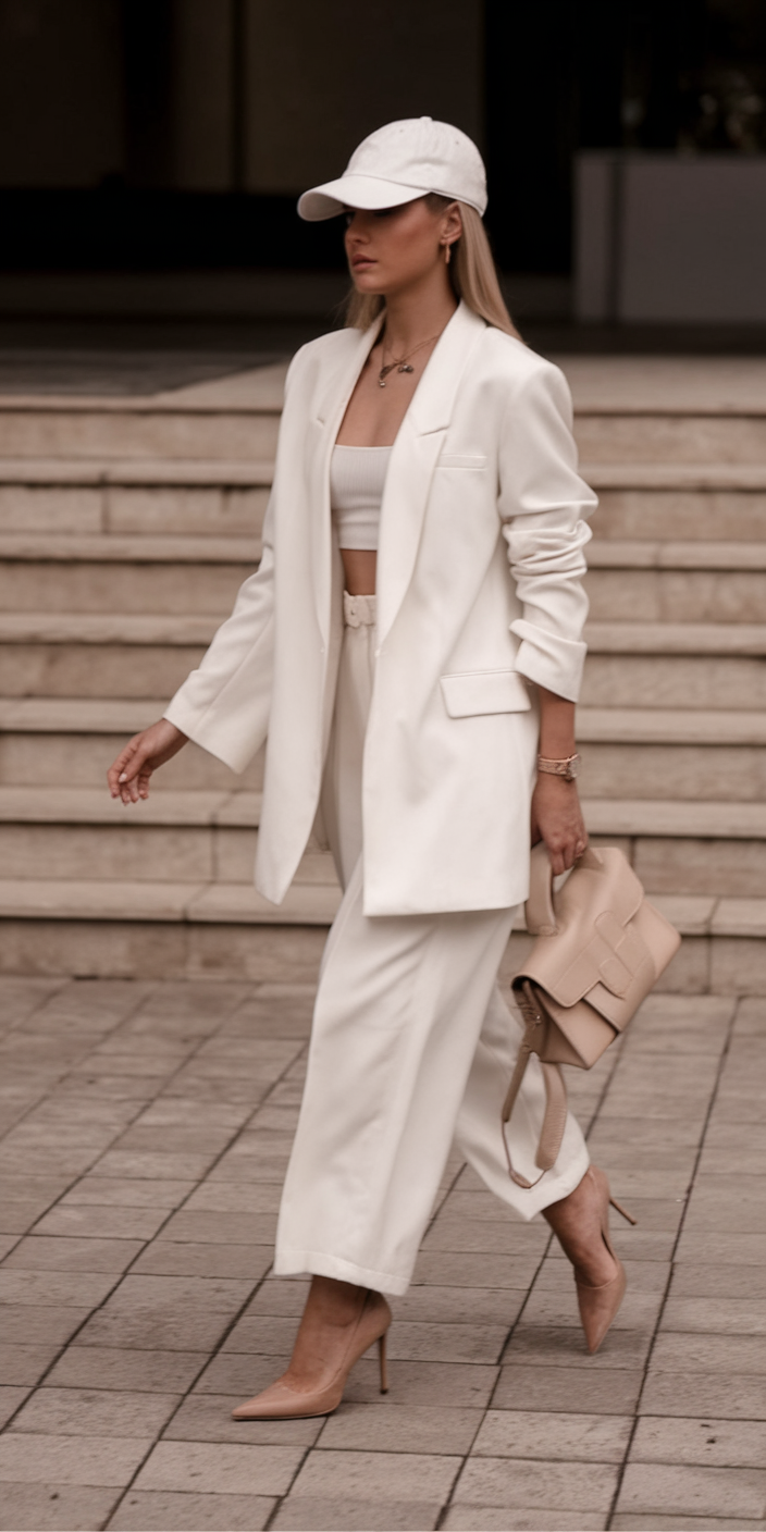 A white tailored blazer with matching wide-leg trousers creates a sleek and polished ensemble for office wear in New York or Paris in early Spring 2025. Styled with a fitted crop top and a matching baseball cap, the look balances professional and relaxed elements effortlessly. Nude heels and a structured handbag elevate the outfit, making it perfect for a business meeting, a stylish school event, or a refined dress option for evening plans in Las Vegas.