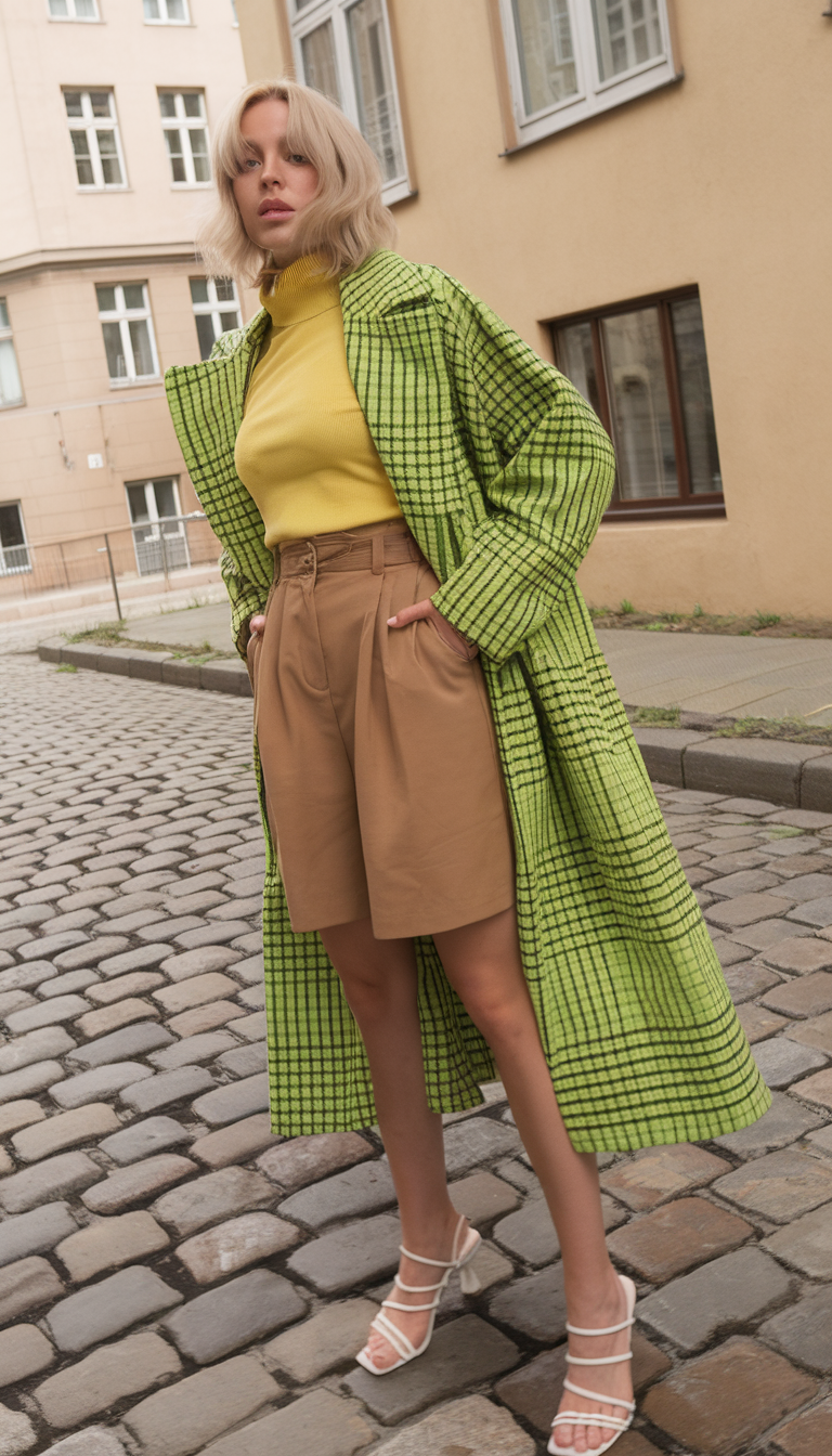 A lime-green plaid trench coat brings a bold contrast to a soft yellow turtleneck sweater, adding warmth and depth to this cold spring look. The high-waisted beige tailored shorts create a refined balance, making the outfit suitable for a casual yet elevated street style in Spain or York. Finished with white strappy heels, this ensemble is an effortlessly stylish choice for Spring 2025 fashion.