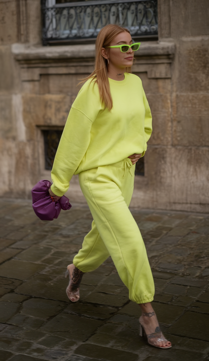 A bright yellow oversized sweatshirt and matching joggers create a casual yet trendy outfit, perfect for a laid-back Spring 2025 day in Las Vegas or to wear in Florida. The bold neon sunglasses add a fun and youthful edge, while a purple ruched handbag provides a striking color contrast. Transparent heeled sandals complete the look, making this loungewear ensemble both stylish and comfortable.