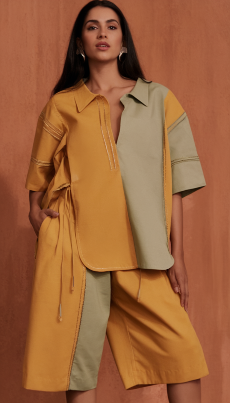 A color-blocked mustard and sage green oversized shirt with asymmetrical stitching is paired with matching knee-length shorts, creating a fresh take on Spring 2025 fashion. The oversized silhouette and structured detailing make this a great casual or workwear option in Spain or Las Vegas. The loose drawstring waist and open collar add an effortless yet refined touch, balancing comfort and style.