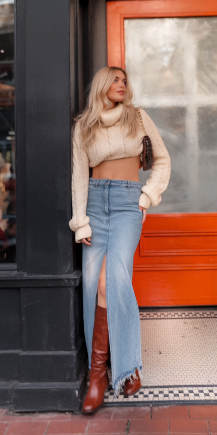 A long denim skirt with a high slit is a fresh take on casual yet fashionable dressing for spring 2025. The fitted turtleneck sweater in a neutral tone keeps it cozy for a cold spring day, while brown knee-high boots add warmth and contrast. Whether strolling through Spain, heading to a school event, or enjoying a relaxed weekend look in Italy in early spring, this outfit blends practicality with style. The size of the skirt’s slit adds a modern edge, making it an easy transition piece from day to night.