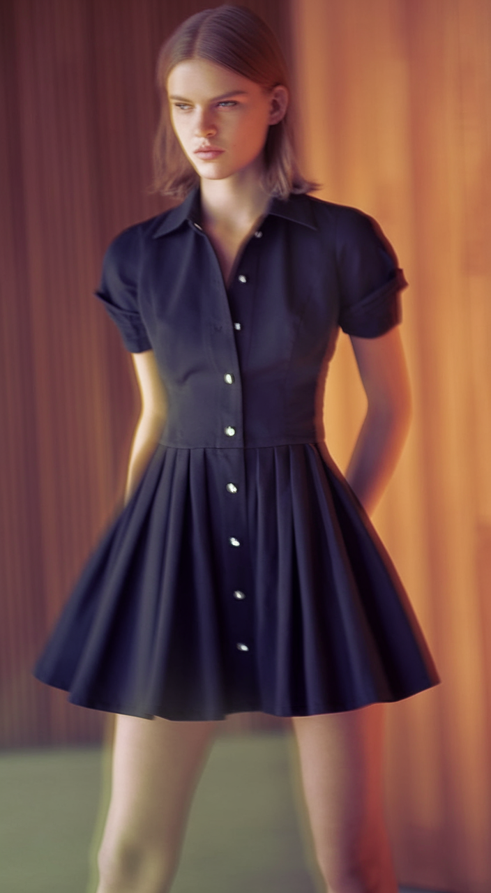 A black button-up dress with a fitted waist and a flared skirt creates a refined yet effortless silhouette. The short-sleeved collar design adds a structured element, making it a great dress for an elegant evening in Paris or a stylish workday in New York. The pleated skirt adds movement, making it suitable to wear in Florida or for a Las Vegas night out. This versatile outfit is an ideal blend of sophistication and modern minimalism for Spring 2025.