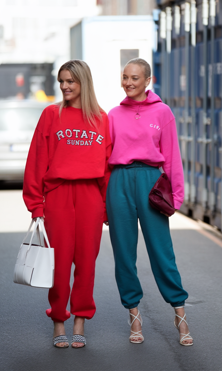 A striking mix of bold colors defines this casual yet fashionable outfit, perfect for a trendy street-style look in Spain or Italy in early spring. The first outfit features a red oversized sweatshirt paired with matching joggers, styled with a white structured handbag for contrast. The second outfit brings together a hot pink hoodie and teal joggers, finished with a burgundy clutch. Both looks are effortlessly comfortable yet stylish, ideal for a cold spring morning or a relaxed day at school.