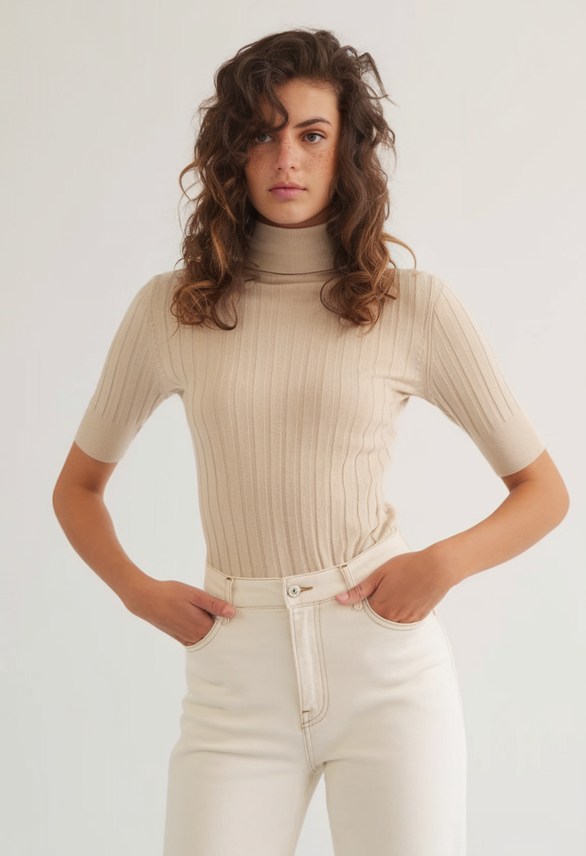 A ribbed beige turtleneck top with short sleeves is the perfect balance of elegance and comfort for Spring 2025. Paired with high-waisted cream jeans, this outfit is ideal for a polished work setting in York or a business-casual look for an office in Paris in early spring. The fitted silhouette enhances the size of the waistline, making it a flattering choice for various occasions. This neutral-toned ensemble is versatile, making it easy to wear in Florida or transition seamlessly from day to night.