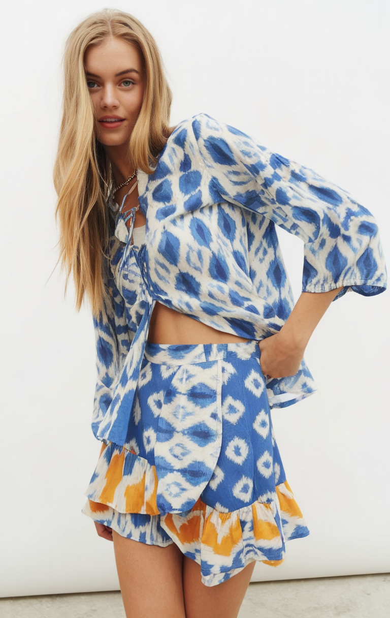 A flowy two-piece set featuring a loose, airy blouse and a tiered mini skirt in blue and orange patterns creates a relaxed yet trendy look for Spring 2025. The lightweight fabric and tie-front detail add a breezy feel, making it ideal for a stylish day in Spain or a casual school outfit. The layered ruffle hemline of the skirt brings movement and texture, making this ensemble effortlessly chic. This aesthetic set is a great choice for cold spring mornings or a sunny afternoon to wear in Florida.