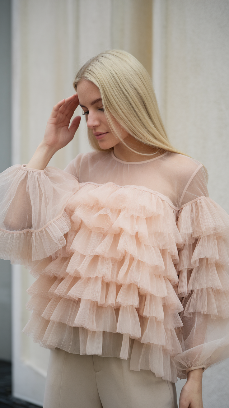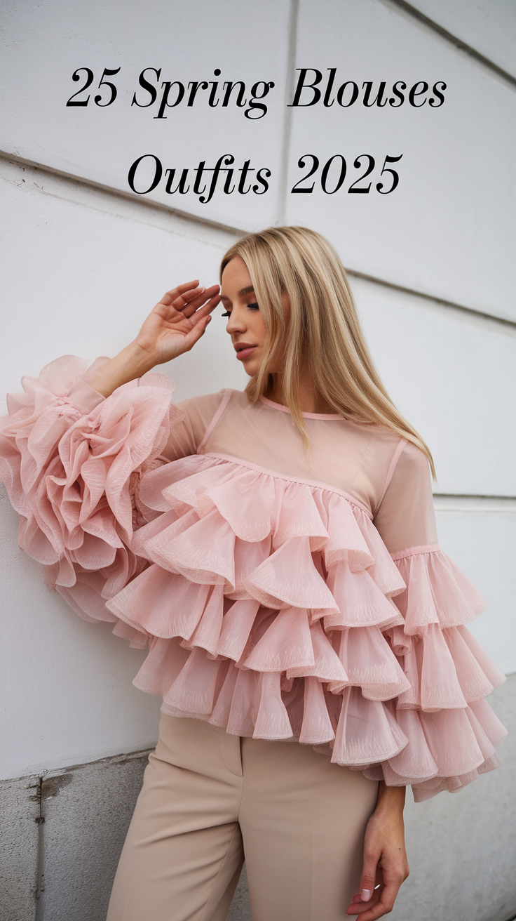 This peach blouse showcases layers of delicate ruffles, creating a soft and romantic look for spring. Paired with neutral-toned pants, it balances the outfit for both casual and special occasions. The airy designs of the blouse add a whimsical charm, making it a standout choice in outfits 2025.