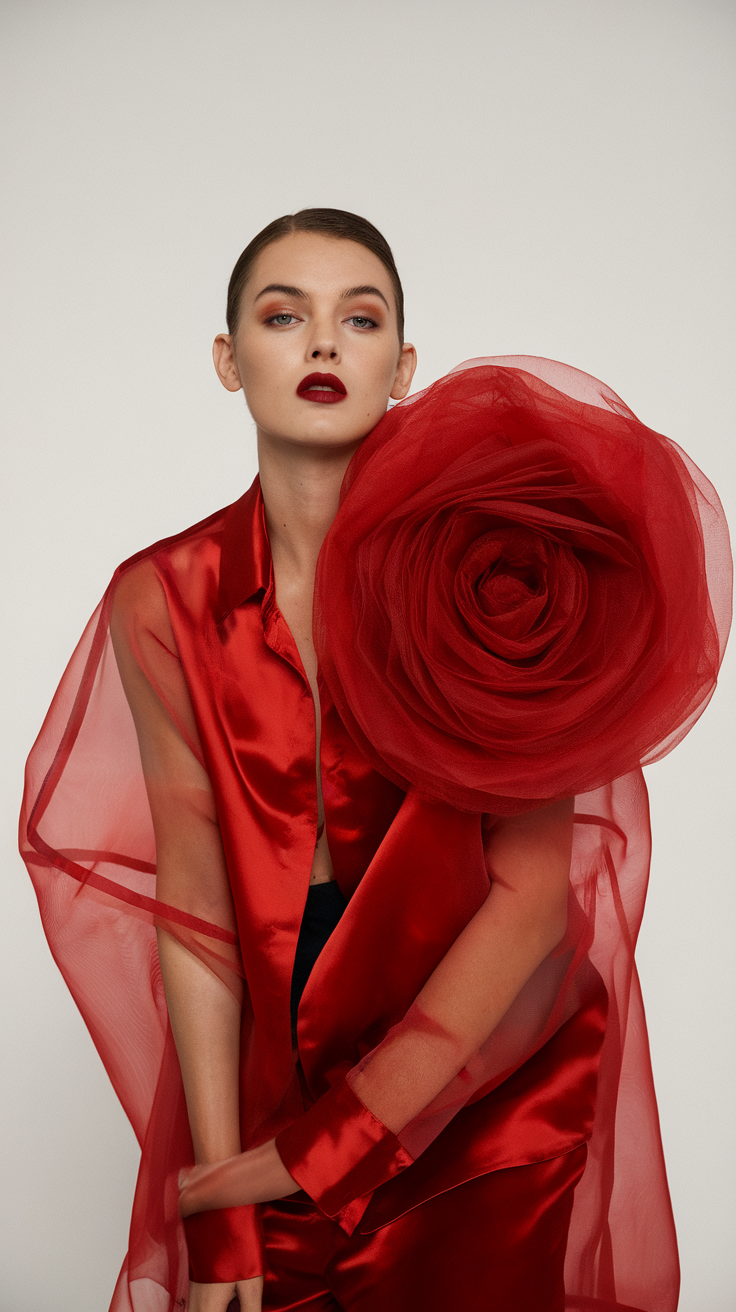This red satin blouse features a statement oversized flower detail, adding a dramatic and artistic touch. The sheer overlay enhances the bold and modern design, making it a standout aesthetic piece for spring. Its structured yet fluid silhouette makes it ideal for women’s outfits 2025 that demand attention.