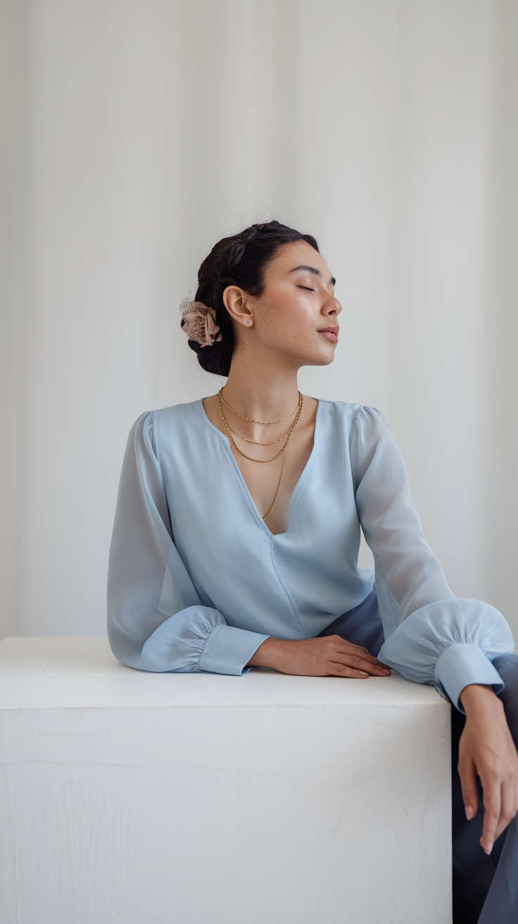 This pale blue blouse features a unique cutout design at the neckline, adding a modern and stylish twist. Its sleek fabric and tailored fit create a sophisticated look, perfect for pairing with high-waisted white trousers. The structured collar and subtle detailing make it ideal for spring outfits 2025.