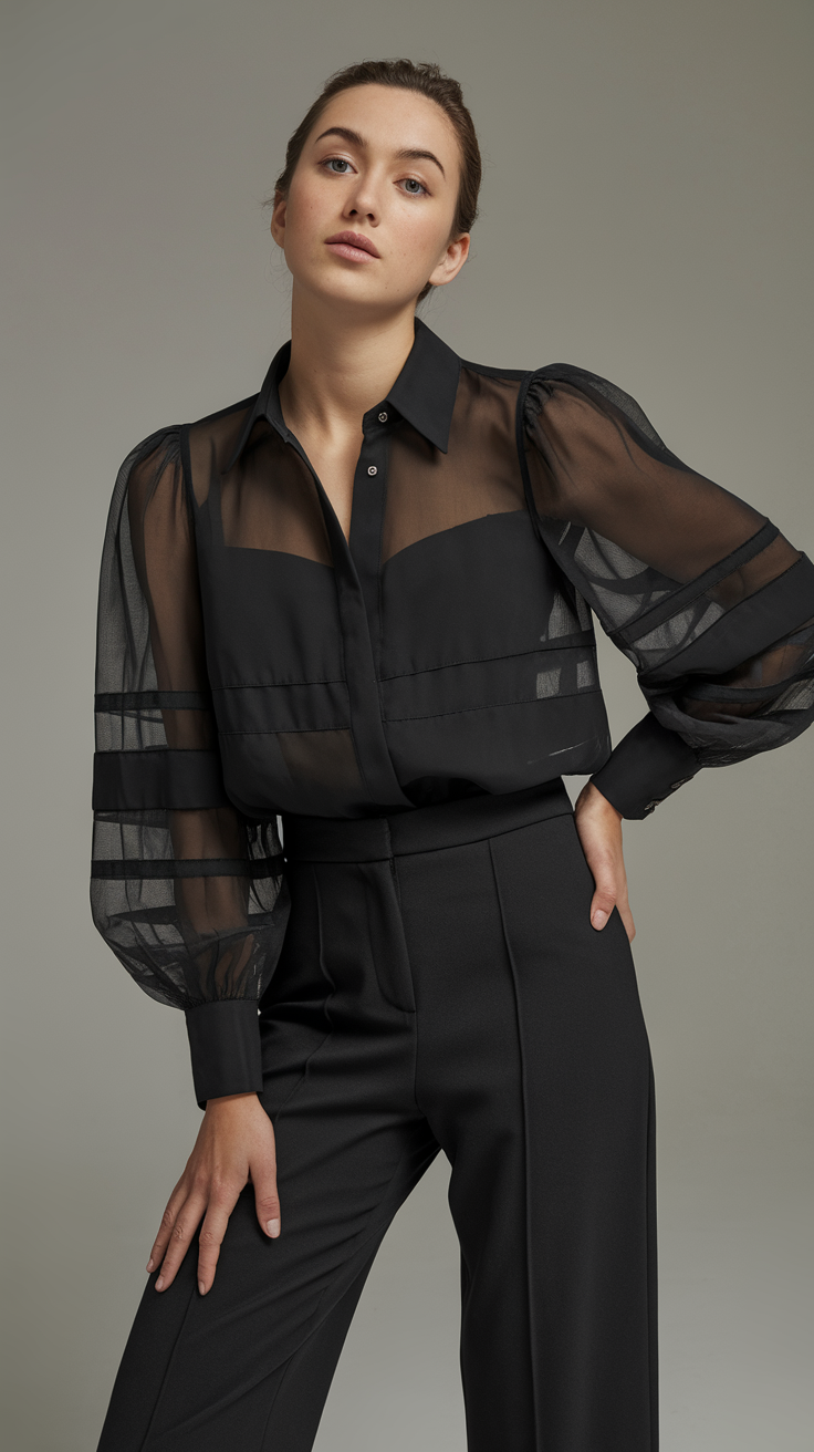 This black blouse is crafted from sheer fabric with structured panels, offering a contemporary and elegant vibe. Paired with tailored black pants, it creates a sleek monochromatic outfit for formal or evening wear. The puffed sleeves and button details add dimension and style to this modern women’s look.