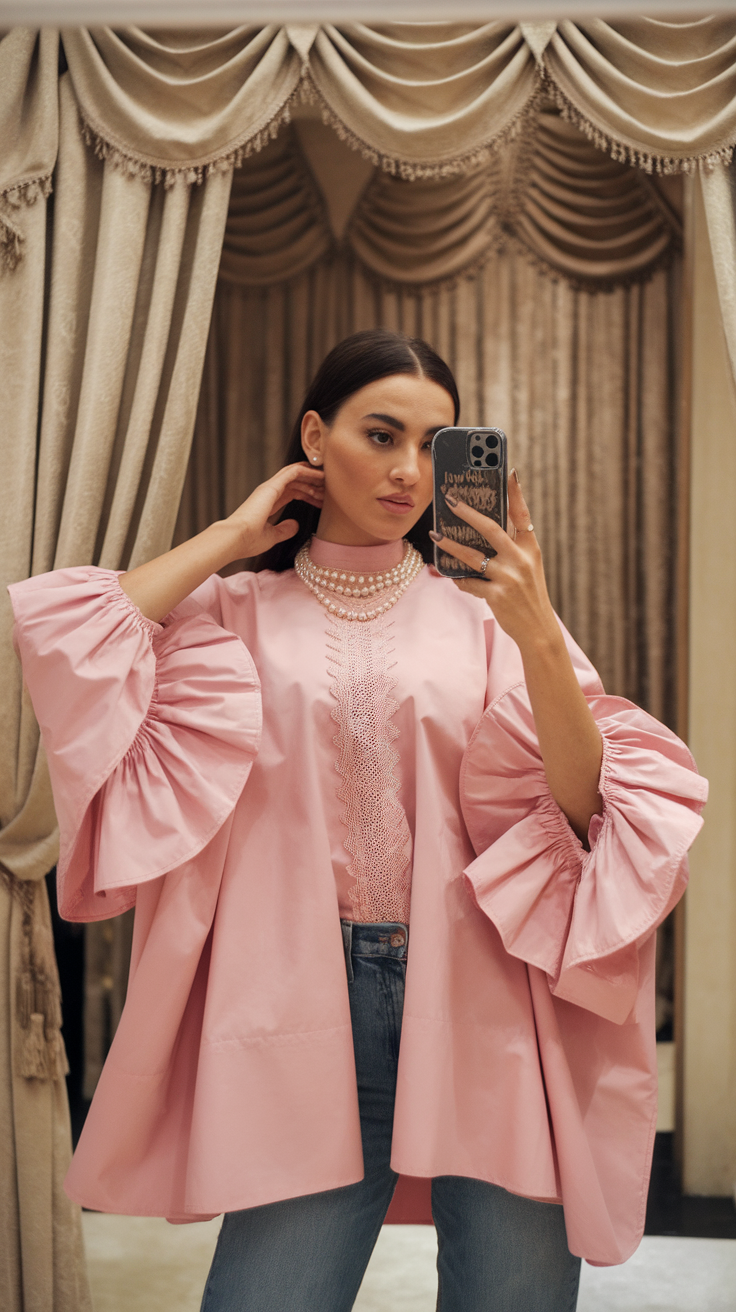 This pink blouse showcases exaggerated ruffle sleeves and intricate embroidery along the front, making it a statement piece. The flowy, oversized silhouette balances casual elegance, complemented perfectly by classic denim. Its playful and bold design is a standout for women’s casual outfits in 2025.