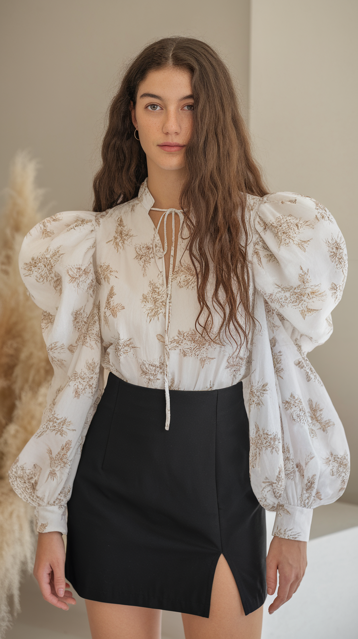 This white blouse features delicate floral embroidery and dramatic puff sleeves for a romantic and elegant look. The tie-neck detail adds a soft, feminine touch, while the fitted black skirt creates a polished contrast. Perfect for spring outfits, this pairing balances timeless charm with modern style.