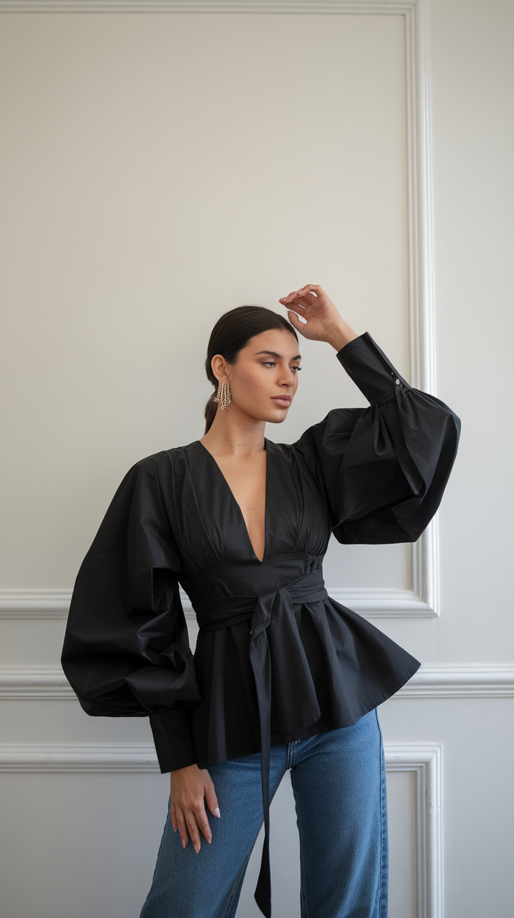 This black blouse features a flattering wrap silhouette with a belted waist for a cinched and elegant look. The oversized balloon sleeves add drama and sophistication, pairing perfectly with blue denim for a modern contrast. It’s an ideal choice for women’s casual yet chic outfits this spring.