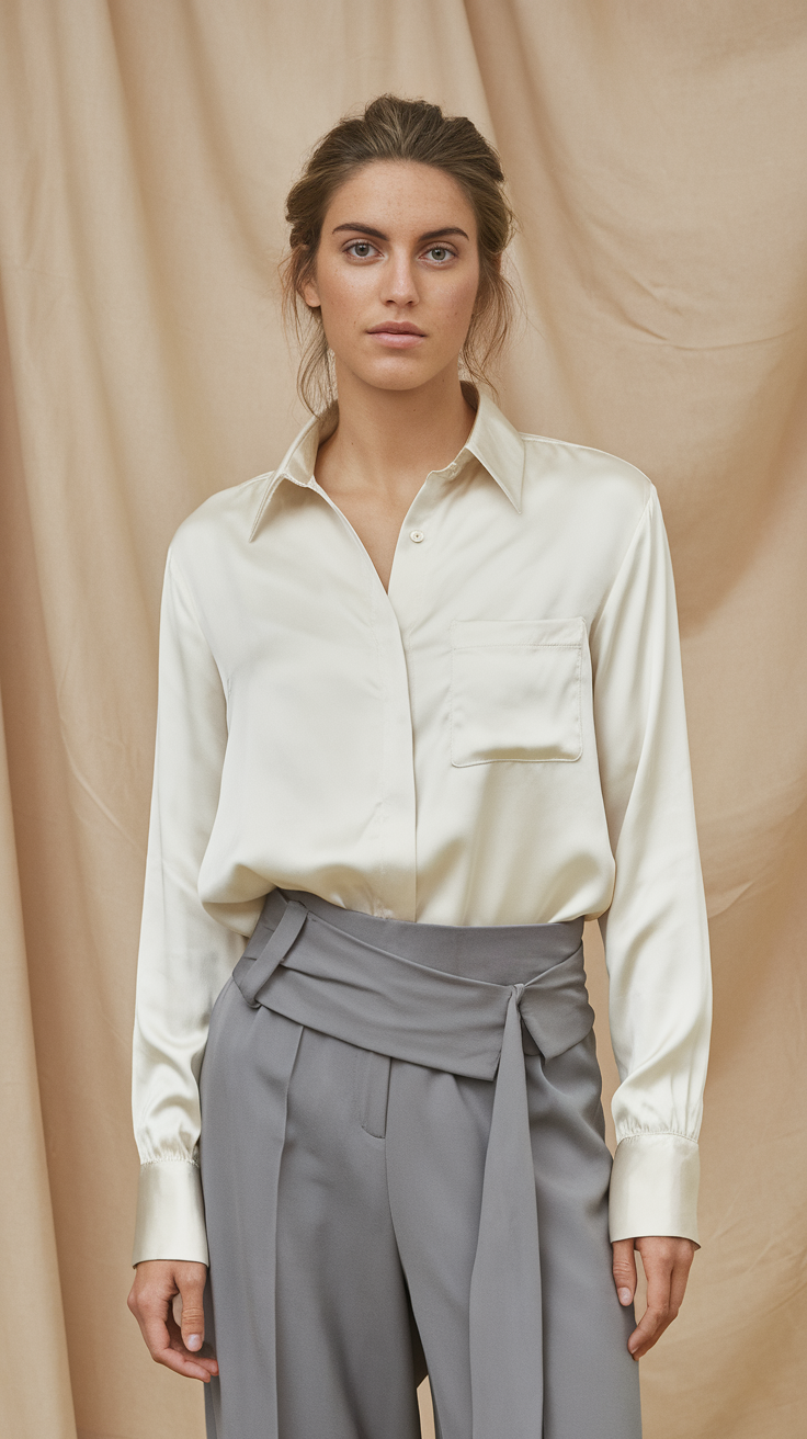 This white satin blouse combines elegance with functionality, featuring clean lines and a soft texture. The wide-leg grey trousers create a balanced and relaxed silhouette, perfect for work or casual wear. Together, the outfit exudes a vintage-inspired aesthetic, ideal for women’s outfits 2025.