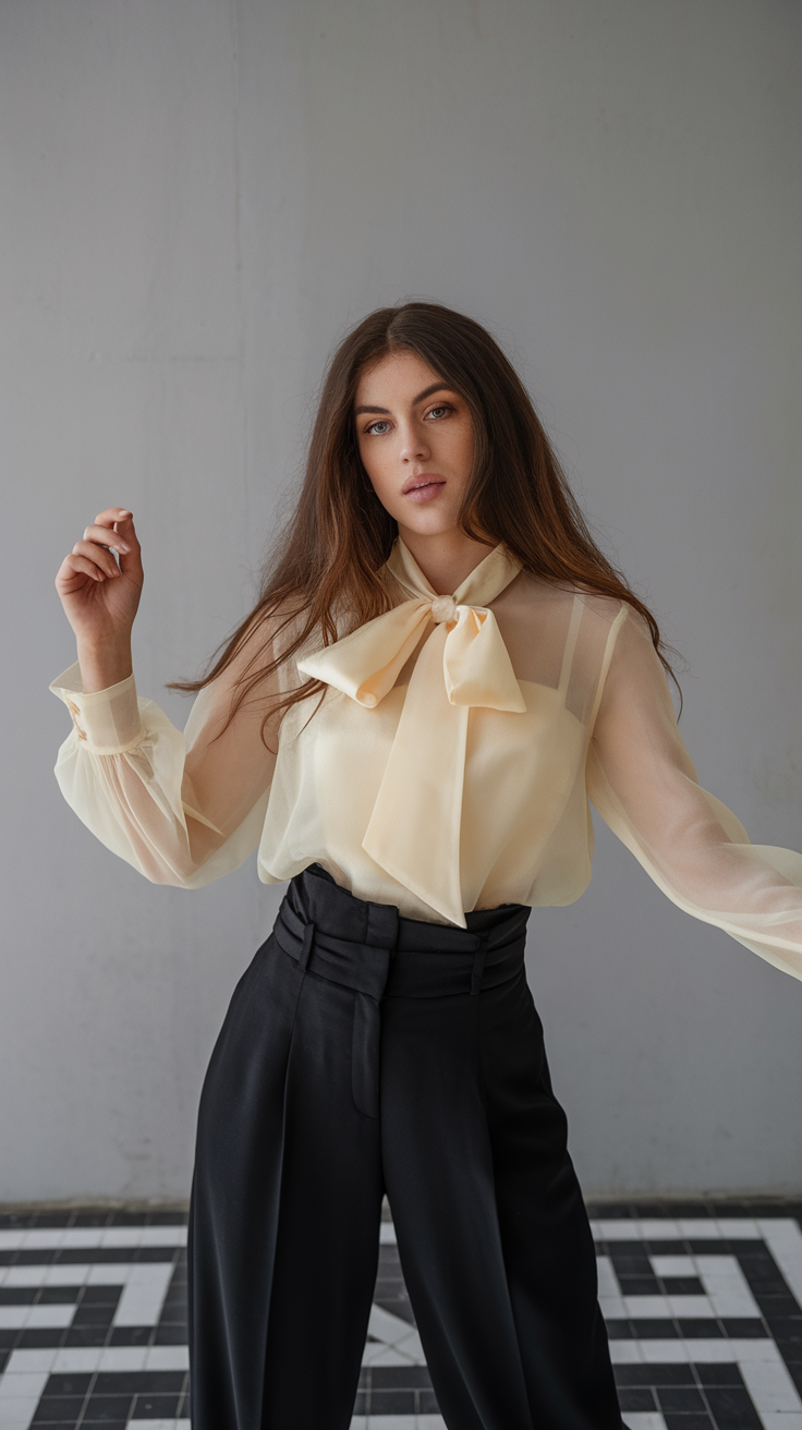This sheer ivory blouse stands out with a dramatic bow detail at the neckline, exuding timeless elegance. Its lightweight, transparent fabric is balanced with soft, puffed sleeves and a structured hemline. Paired with tailored black pants, it’s ideal for pretty, aesthetic work outfits.