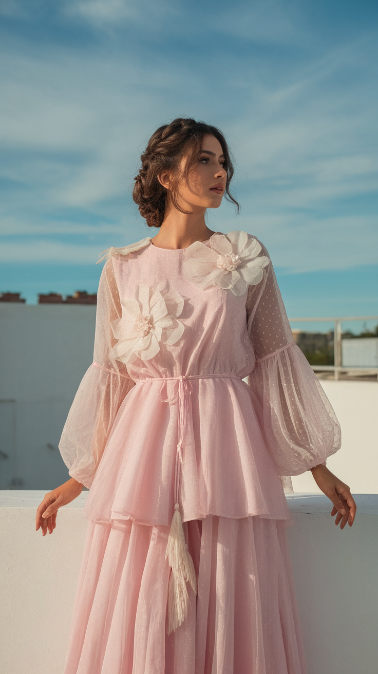 This pastel pink dress showcases oversized fabric flowers on the bodice, enhancing its romantic, springtime design. The polka-dotted sheer sleeves and multi-layered skirt create a flowy, dreamy silhouette. With its cinched waist and tassel tie detail, it’s a stunning choice for vintage-inspired women’s outfits in 2025.