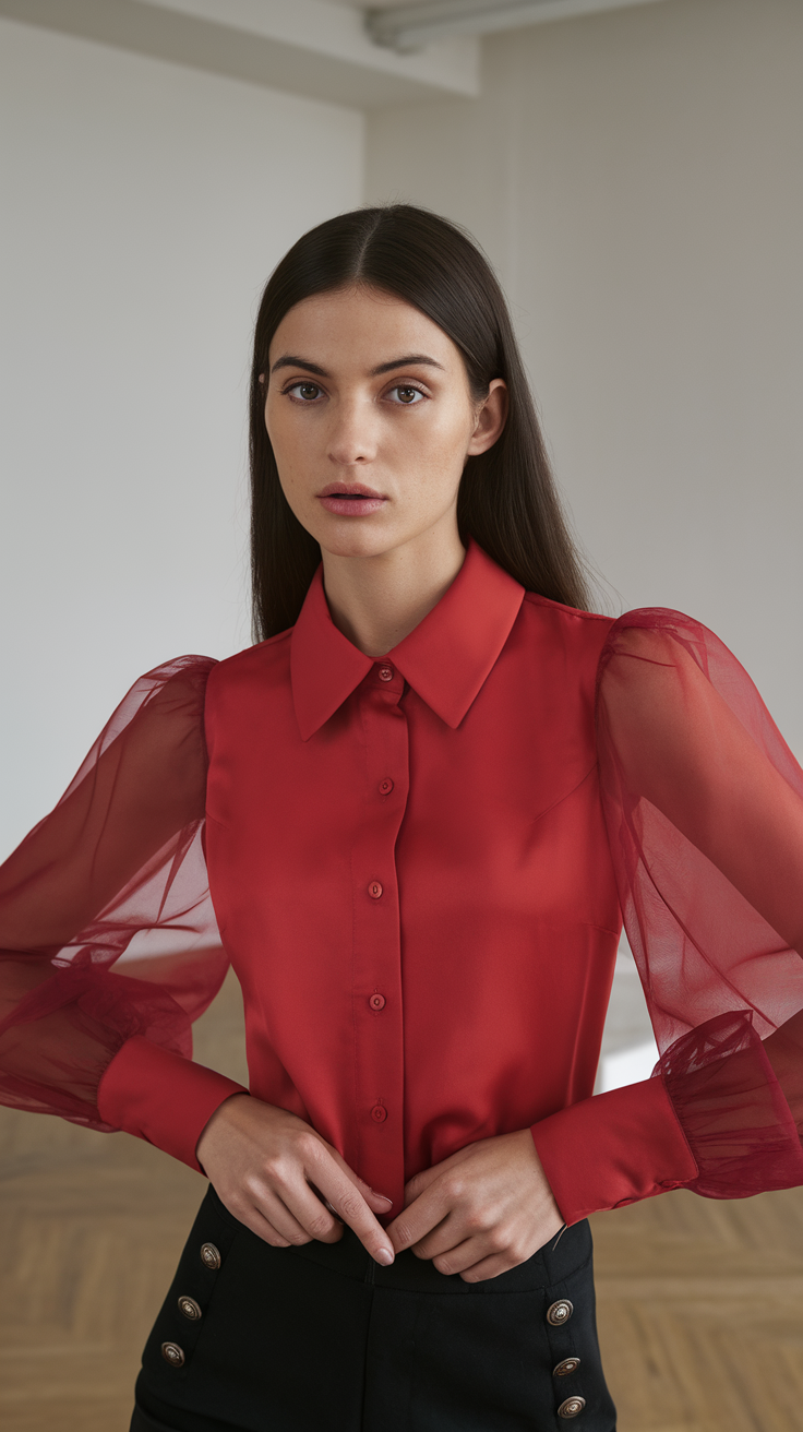 This red blouse is a vibrant showcase of elegance with its structured collar and full button-down front. The semi-sheer balloon sleeves add a dramatic flair, contrasting with the clean, tailored bodice. The fabric’s soft sheen complements the bold color, while the pairing with high-waisted black trousers featuring metallic button accents ensures a timeless yet contemporary vibe.