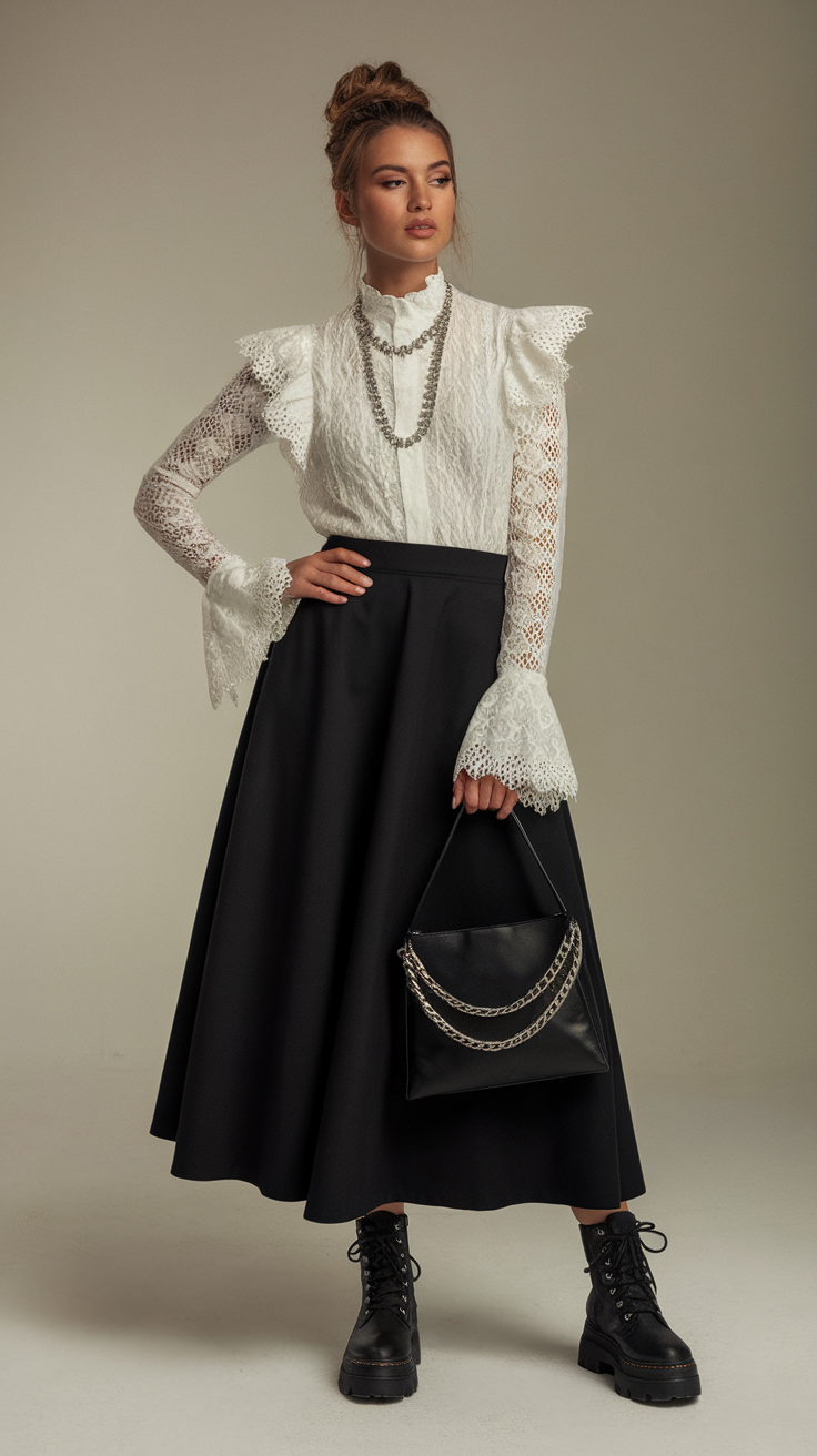 A striking white lace blouse with flared cuffs and ruffled shoulder details creates an air of romantic sophistication. The high-neck design and full lace sleeves bring a vintage charm, while the flowing black A-line skirt adds depth and contrast. Paired with chunky lace-up boots, the outfit is a bold mix of feminine elegance and edgy practicality.