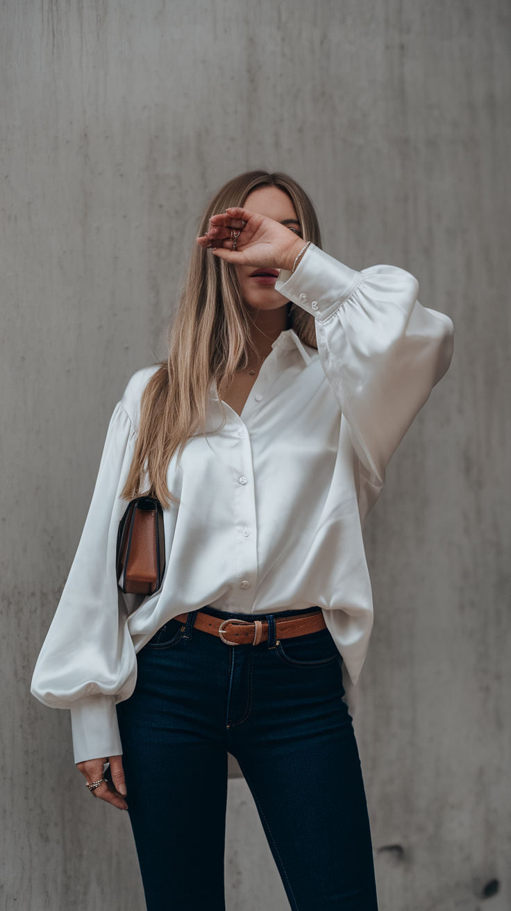 A white blouse with oversized sleeves pairs effortlessly with dark-wash jeans for a timeless and casual look. The flowy design and button details ensure comfort and versatility for daily wear. This cute outfit is perfect for spring, balancing simplicity and style in 2025 fashion.