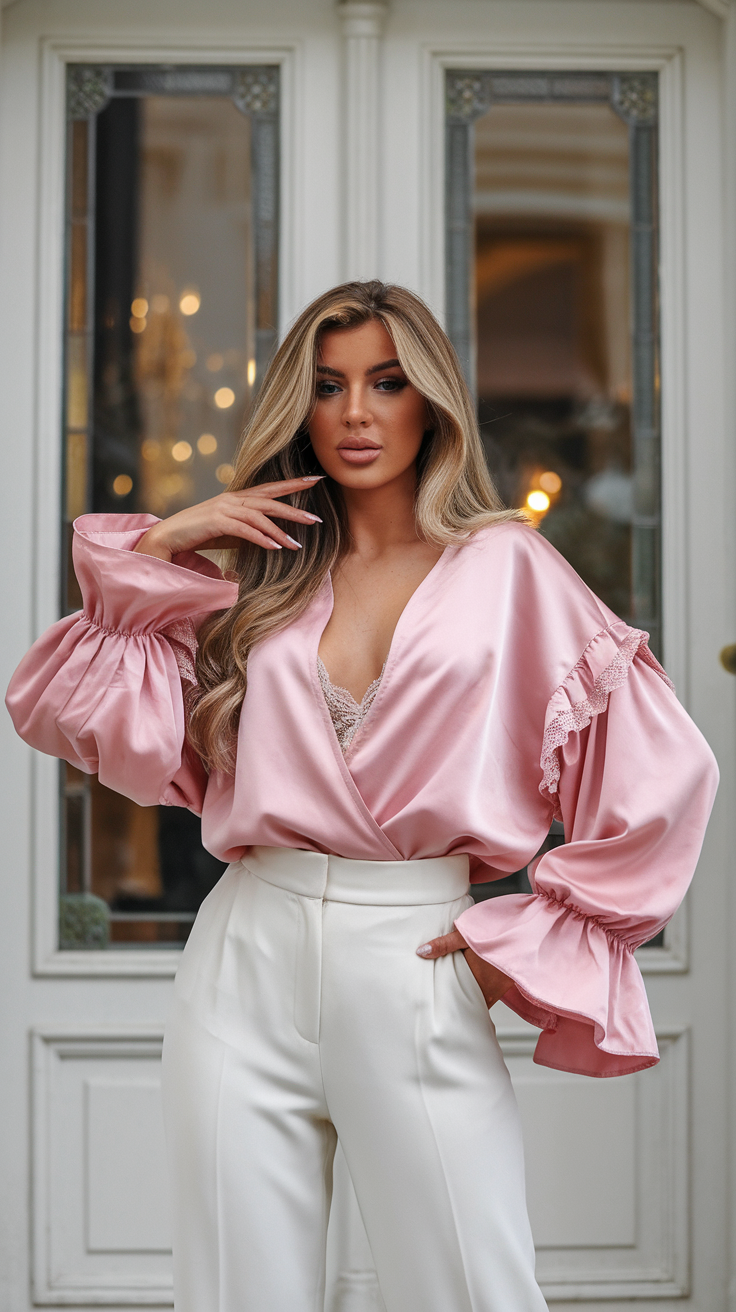This pink satin blouse features voluminous sleeves and lace accents, adding an elegant and romantic touch. Paired with tailored white trousers, it creates a polished and sophisticated outfit for spring. The soft blush tones and flowing fabric make it a pretty and aesthetic choice for women’s outfits 2025.