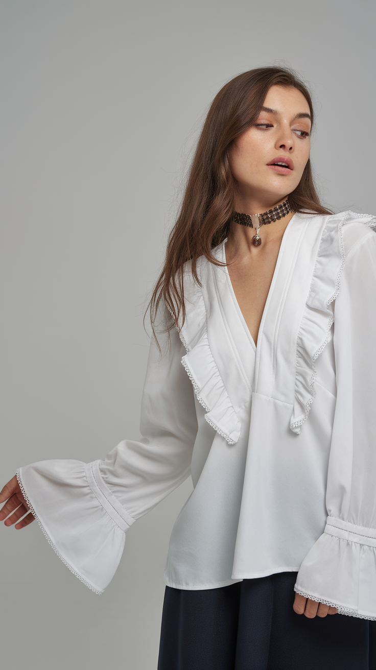 #17 White Blouse with Ruffle Details and Flared Sleeves