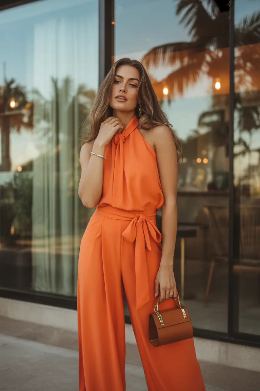 There’s something about orange in spring that feels optimistic. This sleeveless jumpsuit with a waist tie hits that sweet spot between casual and dressy, perfect for those warm evenings that don’t need layers anymore.