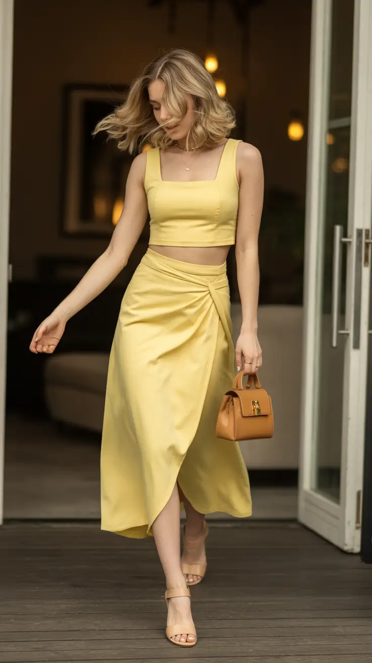Yellow always feels like hope after winter. A cropped top with a wrap-style midi skirt feels feminine without being precious, and it works beautifully for that winter to spring crossover moment.