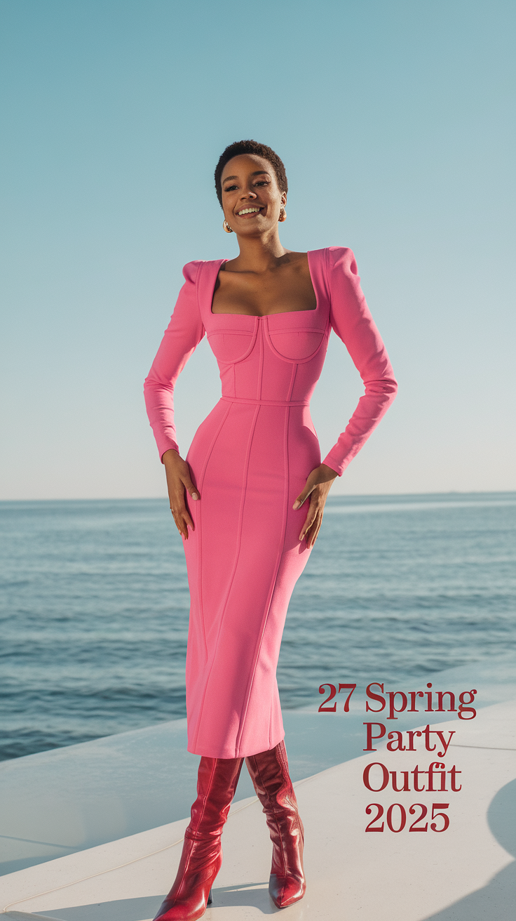 This bright pink mini dress exudes confidence with its sleek, structured design. Featuring long sleeves and a square neckline, it’s a classy option for outdoor spring events during the day. Its bold color and modern aesthetic make it perfect for embracing the 2025 trends while staying chic. Pair it with boots or heels for a seamless transition from early casual gatherings to night 2025 inspo.