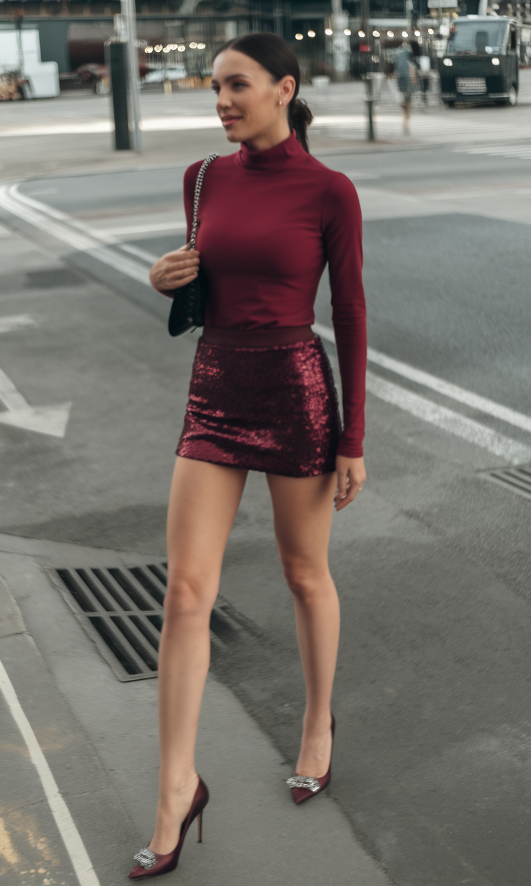 This chic outfit pairs a form-fitting burgundy turtleneck top with a dazzling sequin mini skirt in a matching shade. The shimmering skirt adds a bold and festive flair, making it ideal for night casual or spring party 2025 settings. Sleek stilettos complete this night chic look, perfect for an outdoor evening event.