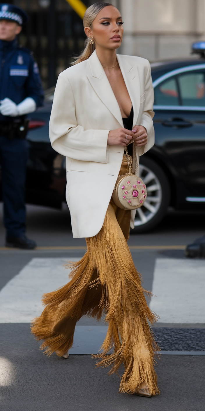 A tailored oversized white blazer is paired with bold mustard-colored fringe trousers, adding movement and texture to this standout look. The blazer’s clean lines contrast beautifully with the playful trousers, making it a trendy option for outdoor daytime inspo or night casual settings. This outfit embodies a perfect balance of professional chic and fun 2025 aesthetics.