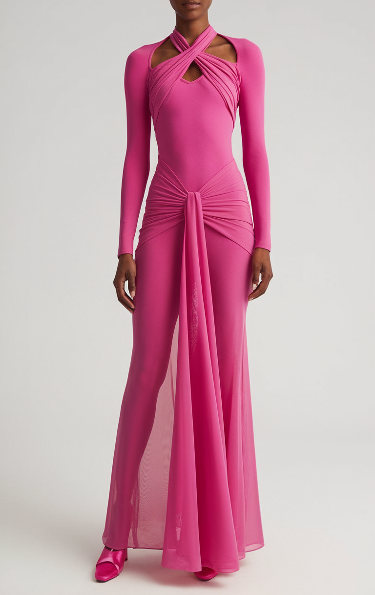This striking gown in vibrant hot pink features a halter neckline with intricate draping and cutout details. The flowing sheer fabric at the bottom adds drama and elegance, making it ideal for night chic occasions or glamorous spring party outfit 2025 events. The bold color and sophisticated design align perfectly with 2025 trends.