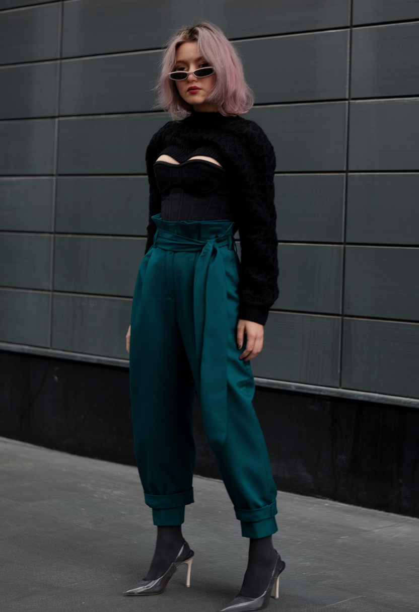 This striking outfit features a structured black corset layered under a textured black sweater, paired with tailored teal high-waisted trousers. The bold trousers, complete with a cinched waist and rolled cuffs, add a modern and edgy touch. This spring party outfit 2025 idea balances elegance and individuality, making it perfect for day casual or night chic settings.