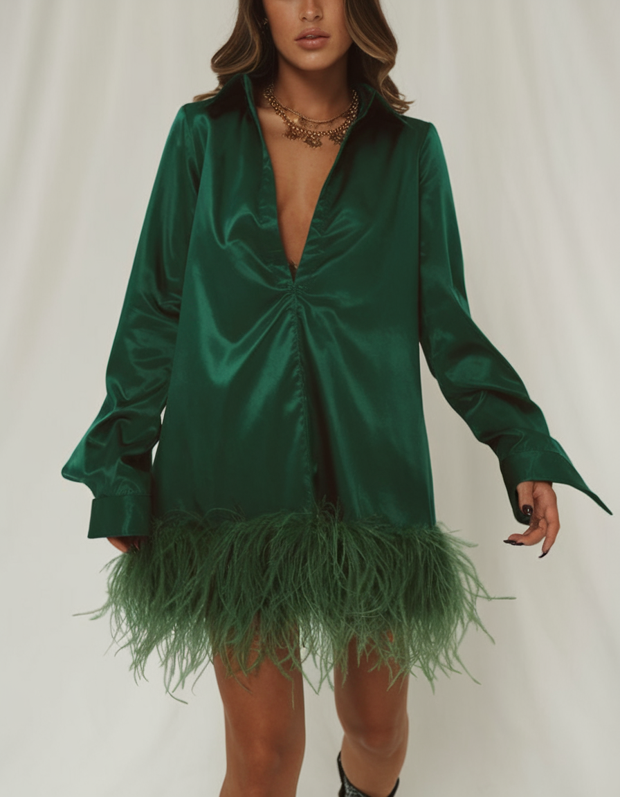 This vibrant emerald green satin mini dress features a plunging neckline and long sleeves for a bold yet refined look. The feather-trimmed hemline adds texture and drama, making it ideal for spring party outfit 2025 ideas. Perfect for night chic occasions, this dress balances elegance and playful sophistication.