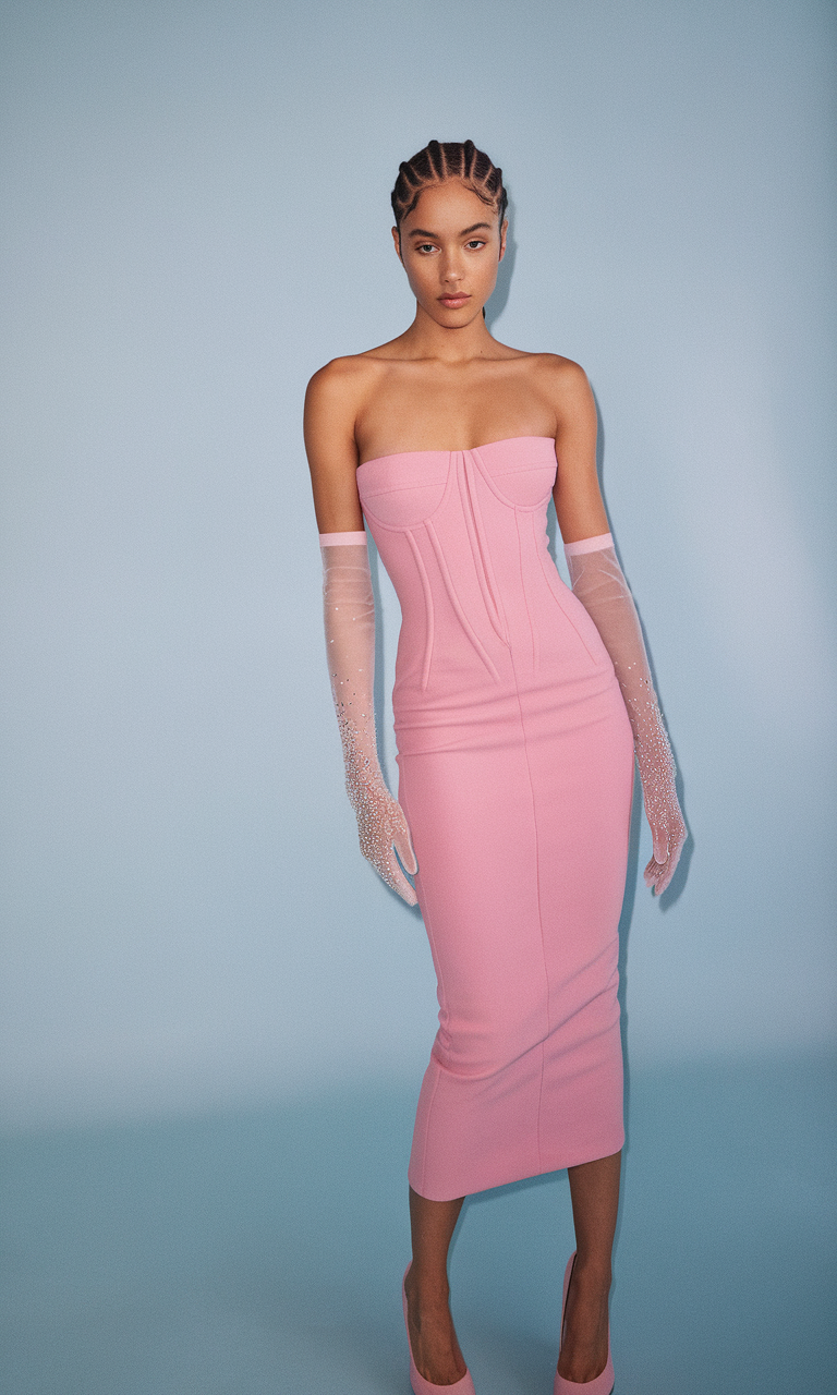 A strapless pastel pink dress with a corset-inspired bodice creates a refined silhouette for women who love an aesthetic dress. The fitted shape and delicate gloves add a touch of elegance, making it ideal for night classy events or formal 2025 trends. This outfit is perfect for an early spring party or a night cold outdoor setting, paired with subtle accessories to complement its charm.