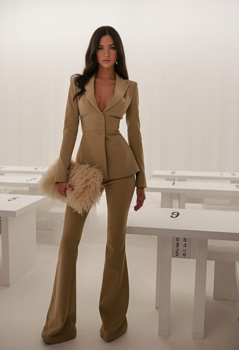 A structured gold pantsuit combines a fitted blazer with flared trousers, creating a sleek silhouette perfect for classy evening events. The deep neckline of the blazer adds a touch of boldness, while the feathered clutch introduces a trendy texture. This outfit exemplifies 2025 trends, blending timeless tailoring with a modern twist for night cold outdoor settings.