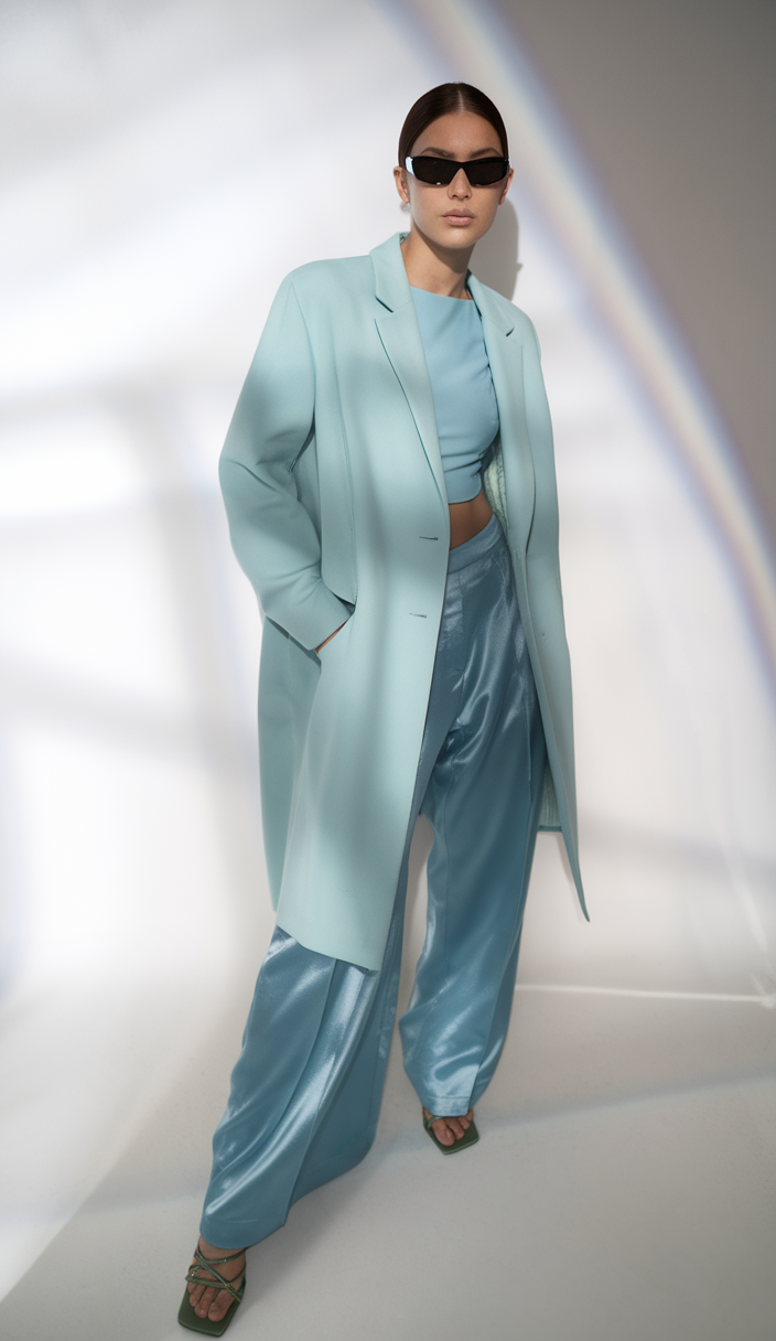 This sophisticated look includes a structured powder blue blazer layered over a matching crop top and wide-leg satin trousers. The subtle shine of the pants contrasts beautifully with the blazer’s clean tailoring, making this a classy choice for day or night outdoor events. This monochromatic outfit fits seamlessly into aesthetic trends for 2025.