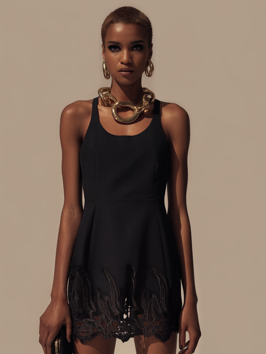 This chic black mini dress stands out with its clean lines and intricate lace hem. The fitted bodice and slightly flared skirt create a flattering silhouette, perfect for night chic occasions. The delicate lacework elevates the look, making it ideal for spring parties or elegant evening events in line with 2025 trends.