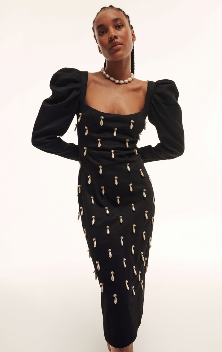 This black midi dress is adorned with pearl-like embellishments, creating a timeless yet modern aesthetic. The puffed sleeves add a touch of sophistication, while the square neckline emphasizes elegance, making it a perfect night classy outfit for spring. The fitted silhouette and intricate detailing are ideal for night cold outdoor events or upscale gatherings, staying in line with 2025 trends.