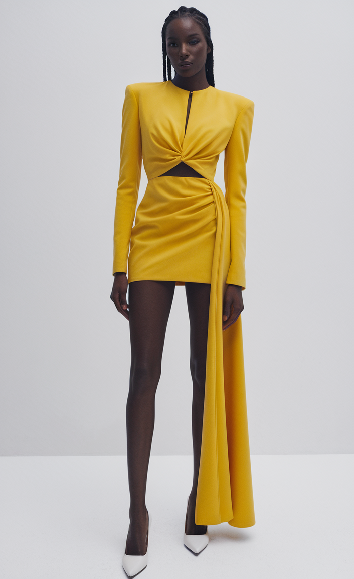 This vibrant yellow mini dress features structured shoulders and a modern cutout detail at the waist. A draped sash adds drama, making it a standout aesthetic dress for a night chic or outdoor spring event. The bright hue and contemporary silhouette align with 2025 trends, perfect for women seeking a bold and fashionable night 2025 look.