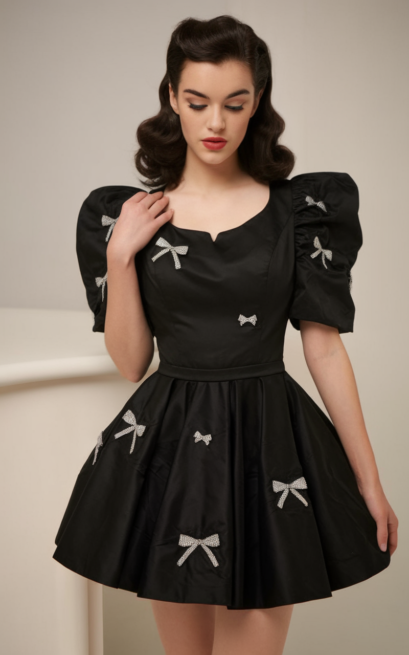 This flirty black mini dress features a fitted bodice, puffed sleeves, and delicate bow embellishments throughout. The voluminous skirt adds a playful touch, making it an ideal aesthetic dress for spring party outfit 2025 ideas. Perfect for night chic outdoor settings or casual indoor gatherings, this look combines charm and timeless elegance.
