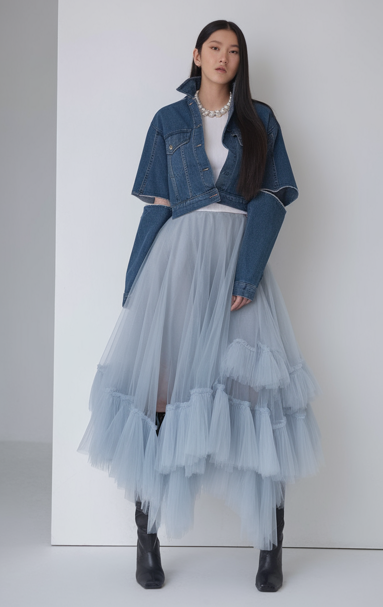 A blue layered tulle maxi skirt pairs effortlessly with a cropped denim jacket for a modern, whimsical look. The contrast between the rugged denim and delicate tulle creates a balanced, trendy aesthetic. Black boots anchor the outfit, making it a bold statement for spring.
